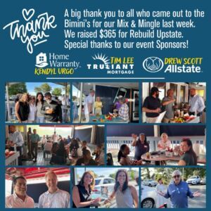 A big thank you to all who came out to the Bimini’s for our Mix & Mingle last week. We raised $365 for Rebuild Upstate. Special thanks to our event Sponsors!